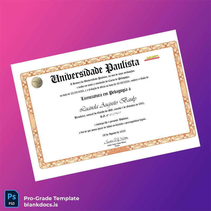 Download the editable Brazil University Paulista Licentiate Degree in Pedagogy Template (Word & PDF) designed for educators and professionals seeking a versatile and high-quality digital diploma document. This template offers a sophisticated and original layout, allowing precise customization of all certificate details with user-friendly Word and PDF formats. Whether replacing a lost diploma or creating a professional presentation, this blank diploma form ensures authenticity and convenience.