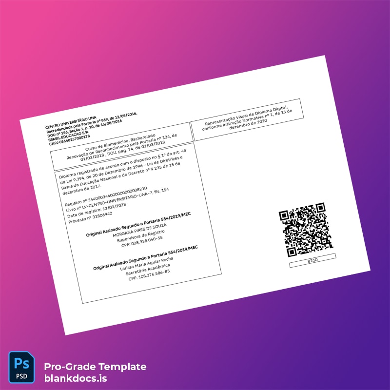 Download the editable Brazil University UNA Bachelor of Science in Biomedicine Template now and start editing your diploma with confidence and precision.