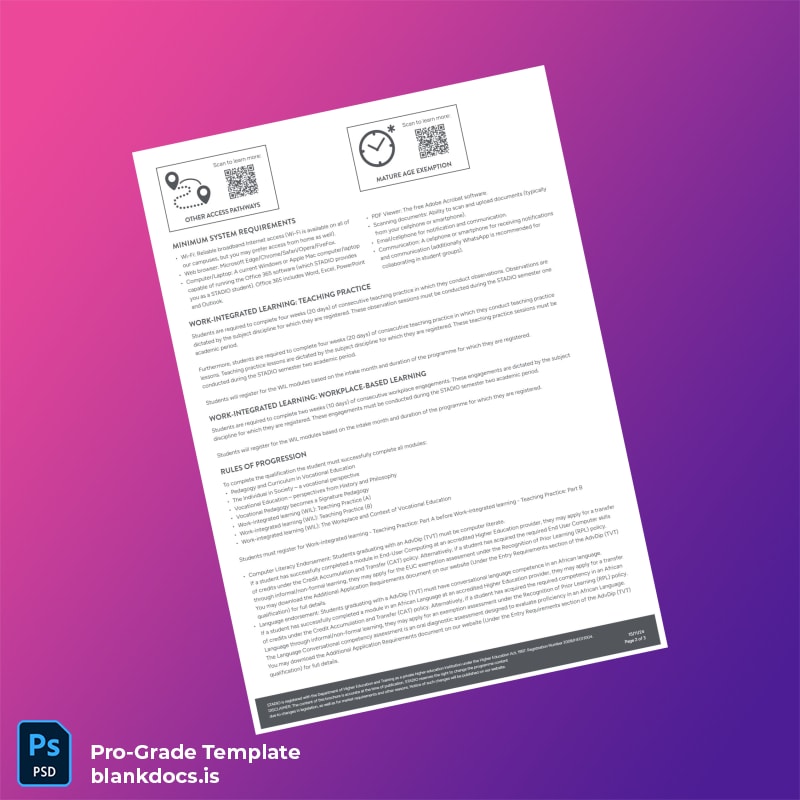 After purchase, instantly download your files and begin customizing the template on your preferred software. This product empowers you with full control over the design and content, allowing professional-grade print results and a perfect representation of your institution’s advanced diploma in technical and vocational teaching.