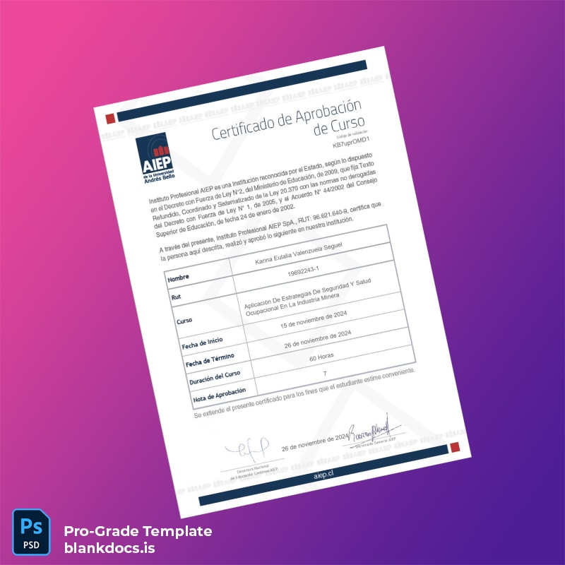 Download the Chile AIEP Professional Institute Diploma Template immediately to customize and print your diploma at your convenience. Empower yourself with a reliable, editable, and professionally designed certificate that ensures your credentials are always presented flawlessly.