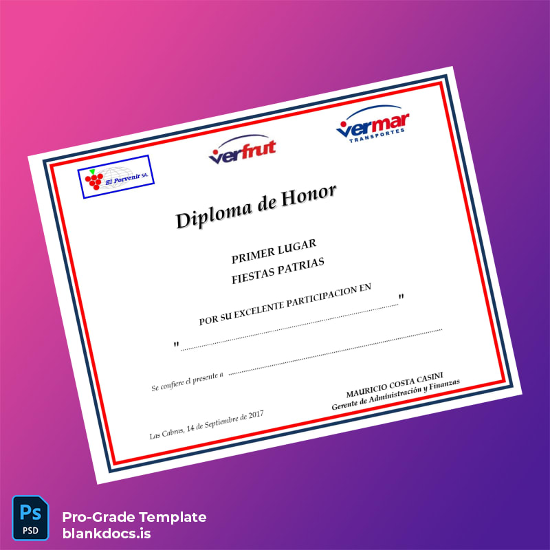 This adaptable diploma template suits educators, event organizers, and administrative professionals seeking a novelty diploma design for Fiestas Patrias or other official celebrations. It is especially useful for those needing a blank diploma form to enter custom information swiftly for award ceremonies or recognition programs.