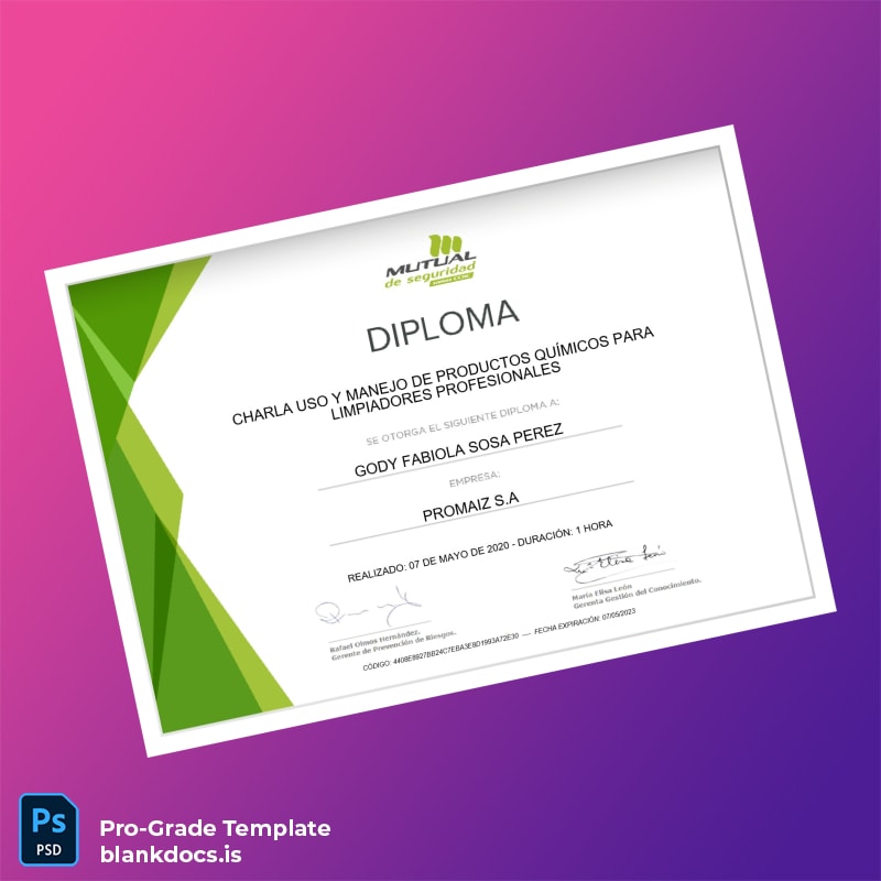 Chile Mutual de Seguridad Diploma Template for Professional Cleaners