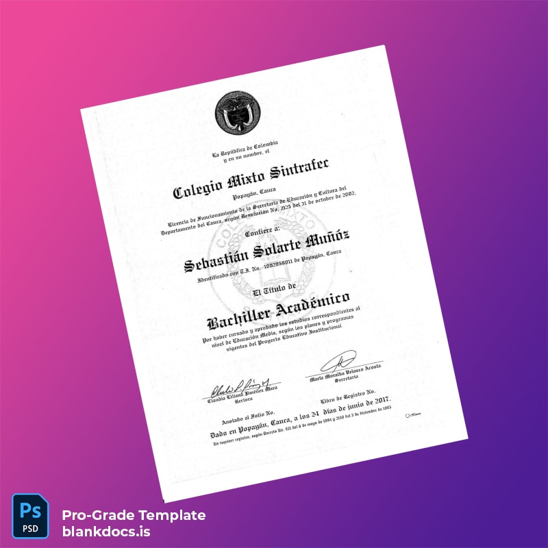 The Colombia Colegio Mixto Sintrafe Bachelor of Arts Diploma Template (Word & PDF) offers an editable, high-quality solution for individuals and institutions needing a precise and professional diploma layout. This blank diploma form caters to users who require a replacement diploma template or a novelty diploma design that is easy to edit and customize. Whether restoring a lost document or creating a professional display, this digital diploma download is crafted for simplicity and authenticity.