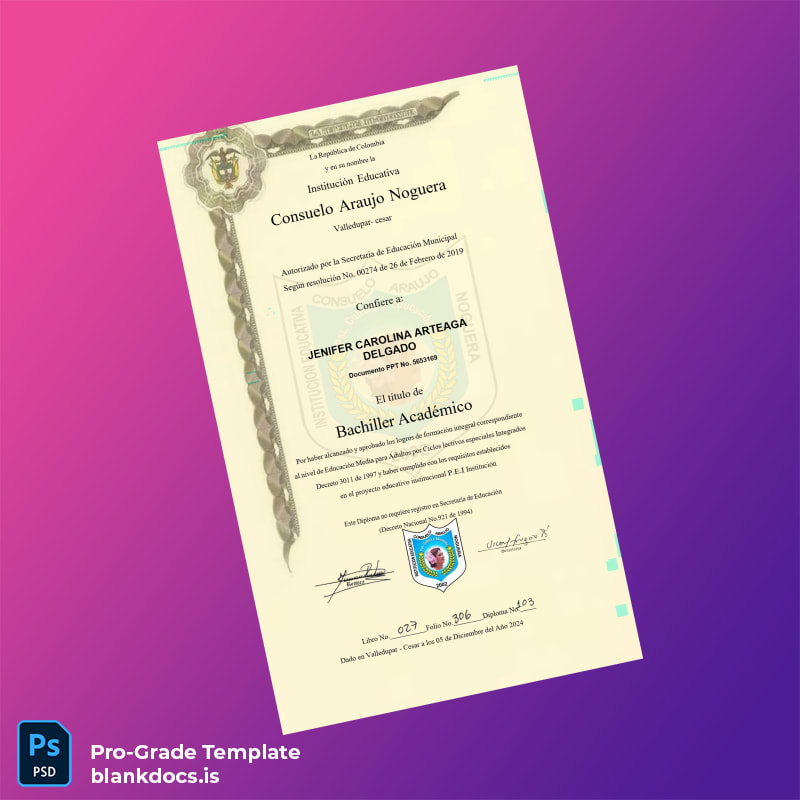Discover the versatility of our Colombia Consuelo Araujo Noguera Academic Bachelor Diploma Template (Word & PDF), designed specifically for professionals who require a realistic, editable diploma that can be customized swiftly and efficiently. This high-quality digital template offers convenience and precision for those needing a neat, professional diploma replacement or customization.