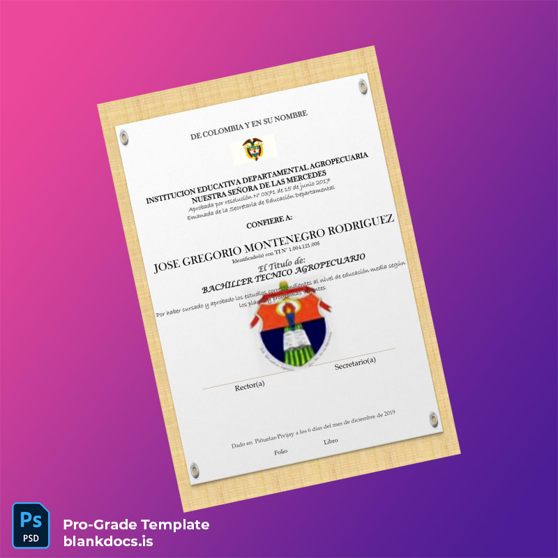 The Colombia Institución Educativa Departamental Agropecuaria Nuestra Señora de las Mercedes Technical High School Diploma Template (Word & PDF) offers a professional, editable, and high-quality digital solution for creating authentic diploma certificates. Designed for educators, administrators, and individuals seeking a reliable replacement or customizable blank diploma form, this template combines technical precision with user-friendly features.