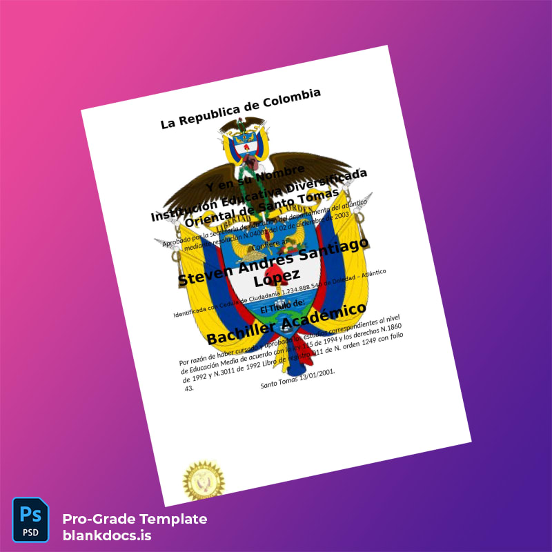 Our Colombia Institución Educativa Diversificada Oriental de Santo Tomás Academic Bachelor Diploma Template (Word & PDF) offers a versatile and easily customizable solution specifically designed for professionals seeking a high-quality blank diploma form. This digital diploma download features a meticulously crafted design consistent with academic standards, providing you with a reliable replacement diploma template that can be edited seamlessly to include any personal or institutional information.