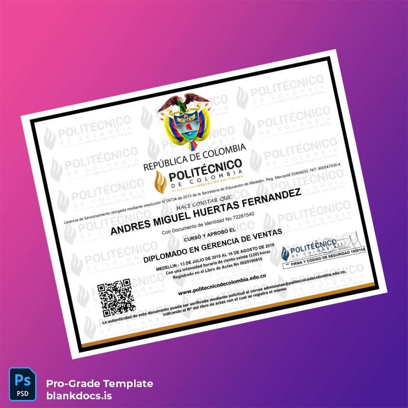 This editable diploma template offers a professional and fully customizable solution for anyone needing a high-quality blank diploma form specifically designed for sales management credentials from Politécnico de Colombia. Perfectly crafted for seamless editing, this template supports both Word and PDF formats, allowing easy modifications including names, dates, and other critical details without compromising the original layout or design aesthetics.