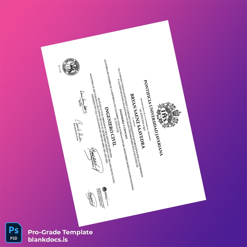 Custom Colombia Pontificia Universidad Javeriana Bachelor of Civil Engineering Diploma Template (Word & PDF) – Fully Customizable