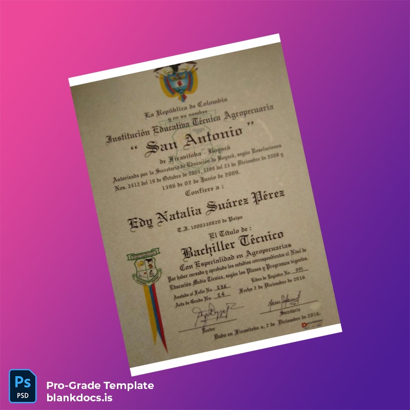 Discover the Colombia San Antonio Technical Educational Institution Technical High School Diploma Template (Word & PDF)