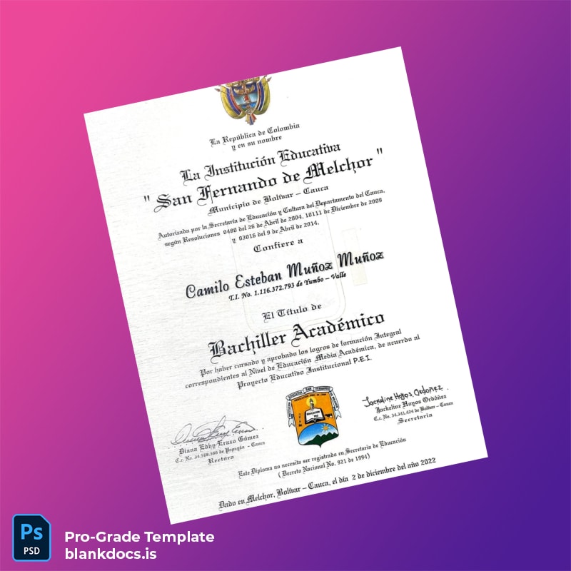 Custom Colombia San Fernando de Melchor High School Academic Bachelor Diploma Template (Word & PDF) Fully Customizable
