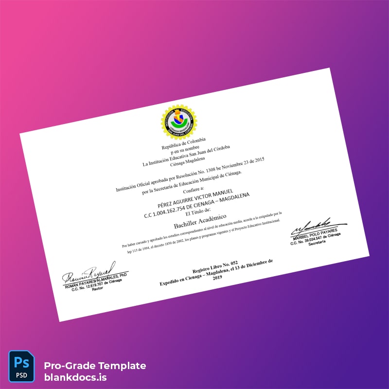 Colombia San Juan del Córdoba High School Diploma Template (Word & PDF)