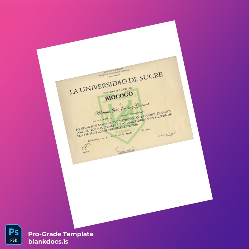 This editable diploma template offers a professional and fully customizable solution for recreating or replacing your Colombia Universidad de Sucre Biologist diploma. Crafted for graduates, educational institutes, and document specialists, this blank diploma form is designed in both Word and PDF formats, ensuring seamless editing and high-quality printing.