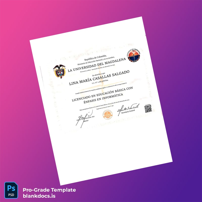 Discover the Colombia Universidad del Magdalena Bachelor of Education with Emphasis in Informatics Template offered in fully editable Word and PDF formats, designed for professionals seeking a pristine blank diploma form to personalize with ease. This digital download caters to educators, administrators, and individuals requiring a seamless replacement diploma template with a modern and authentic appearance.