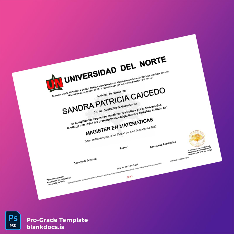 This replacement diploma template supports professionals who require an accurate, editable version of their Master in Mathematics certification from Universidad del Norte. It facilitates timely document recreation, preventing delays in employment or academic verification. The customizable format also suits creative projects, educational displays, and commemorative purposes, providing a versatile solution for various diploma-related needs.