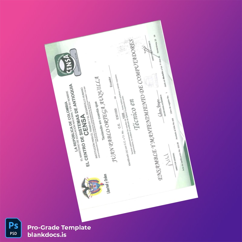 Discover the versatile Ecuador Censa Technical Diploma in Assembly and Maintenance Template (Word & PDF) designed for professionals seeking a reliable and editable diploma solution. This blank diploma form allows for seamless personalization, including name, date, and certification specifics, catering to those requiring a replacement diploma, a novelty diploma design, or a digital diploma download.