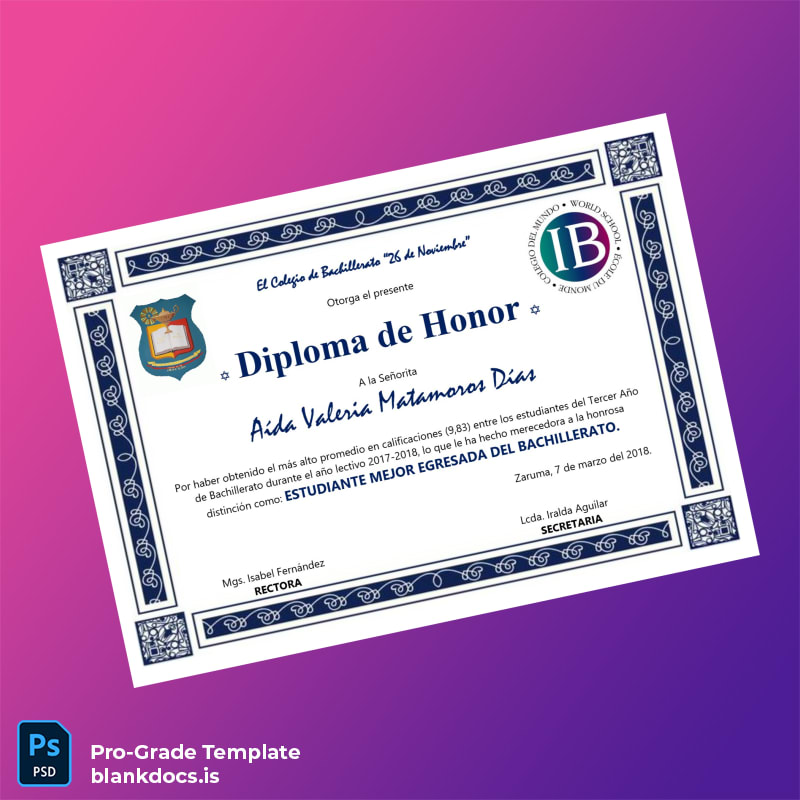 Ecuador Colegio de Bachillerato _26 de Noviembre_ Honor Diploma Template (Word & PDF)