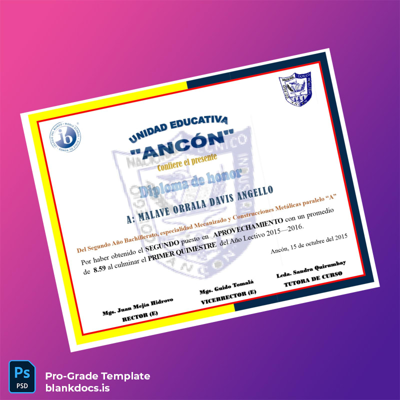 The Ecuador Unidad Educativa _Ancón_ Honor Diploma Template (Word & PDF) offers a seamless way for educators, administrators, and professionals to create high-quality honor diplomas with ease. Designed for versatility, this blank diploma form enables users to edit all fields, including names, dates, and honors, providing a tailored certification experience that meets diverse academic requirements.