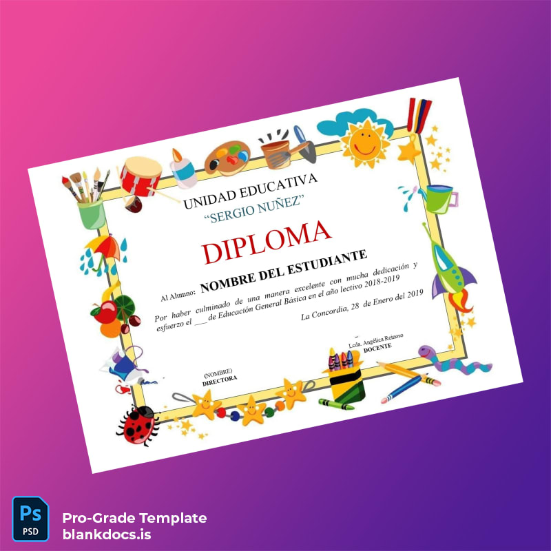 Download the editable Ecuador Unidad Educativa _Sergio Nuñez_ Diploma Certificate Template (Word & PDF). Blank, fully customizable and easy to edit.