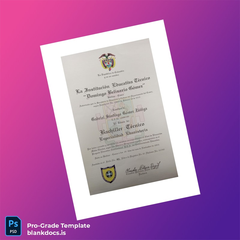 Download the Colombia La Institución Educativa Técnica “Domingo Belisario Gómez” Technical High School Diploma in Banking Template today and quickly prepare a professional, fully editable diploma that meets your specific requirements.