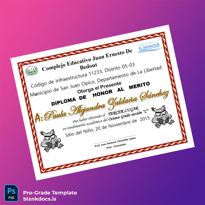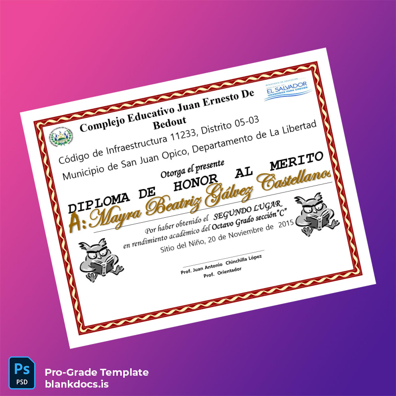 Download the El Salvador Complejo Educativo Juan Ernesto de Bedout Honor Diploma Template today and confidently produce personalized diplomas that meet exacting professional standards and individual needs.