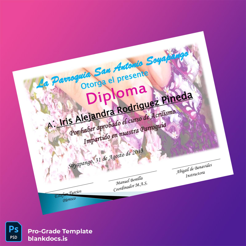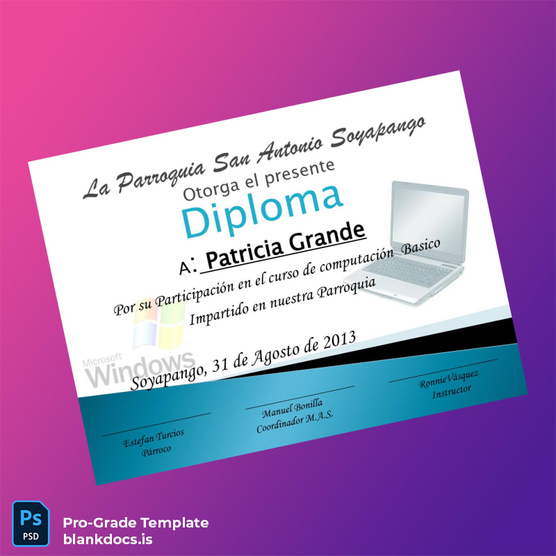 Download the El Salvador Parroquia San Antonio Soyapango Basic Computing Diploma Template (Word & PDF) now and begin editing your diploma immediately. This fillable template is designed to empower you with easy-to-use tools for creating a professional, authentic-looking diploma tailored entirely to your needs.