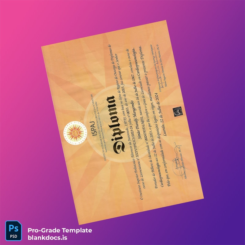 Effortlessly create professional-grade diploma certificates with the Mozambique Instituto Superior Politécnico Jovens da Inventividade Diploma Template (Word & PDF), designed to provide a completely editable and blank diploma form. This template caters to educators, administrative professionals, and graduates seeking a polished, legitimate-looking diploma replacement or novelty design accessible through digital diploma download.