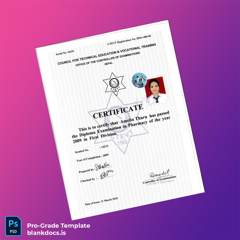 Discover the ultimate editable diploma template crafted specifically for the Nepal Council for Technical Education and Vocational Training Diploma in Pharmacy. This digital diploma download provides you with a high-resolution, professional-grade Word & PDF template that can be fully customized to suit your unique requirements. Whether you need a replacement diploma template or a blank diploma form for documentation purposes, this product delivers a versatile and easy-to-use solution.