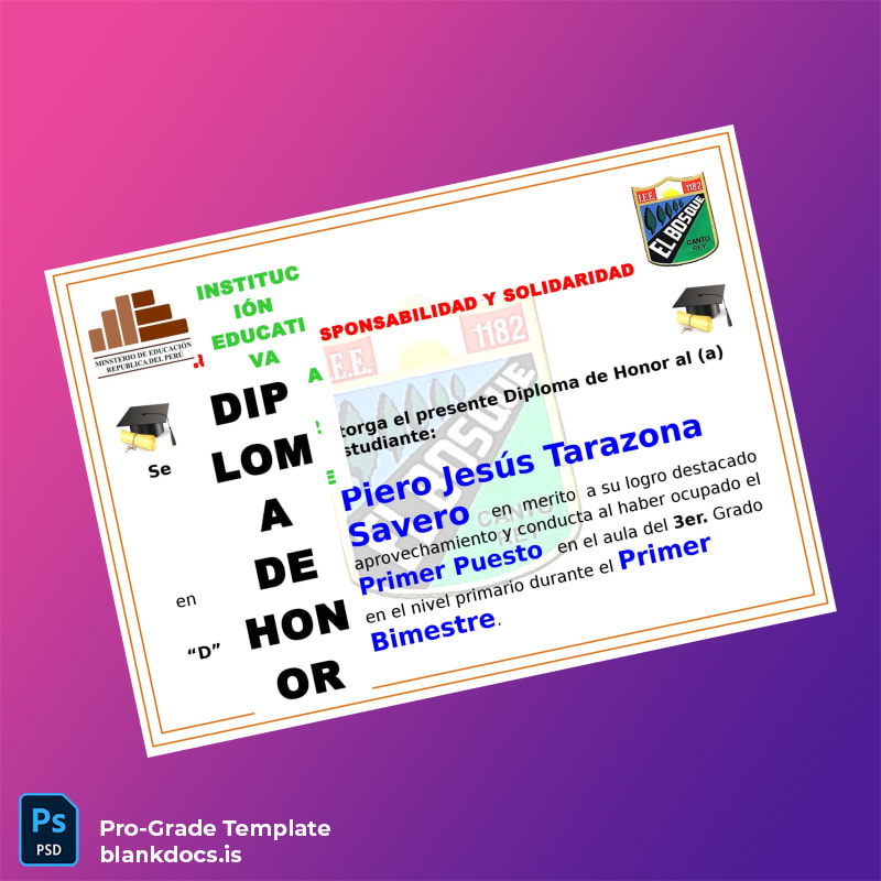 Discover the convenience and versatility of the Peru Bosque School Honor Diploma Template, designed explicitly for professionals seeking a reliable, editable diploma format. This template is expertly crafted to meet the needs of those requiring a blank diploma form with extensive customization options while ensuring professional-grade output for any occasion.