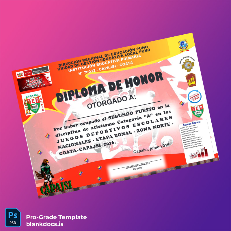 Discover the Peru Capajsi Coata Honor Diploma Template designed for professionals who require a versatile and editable document to replace or create official diplomas seamlessly. This blank diploma template offers a high-resolution format compatible with Microsoft Word and PDF readers, making it ideal for customization, quick modifications, and professional-quality printouts at any scale.