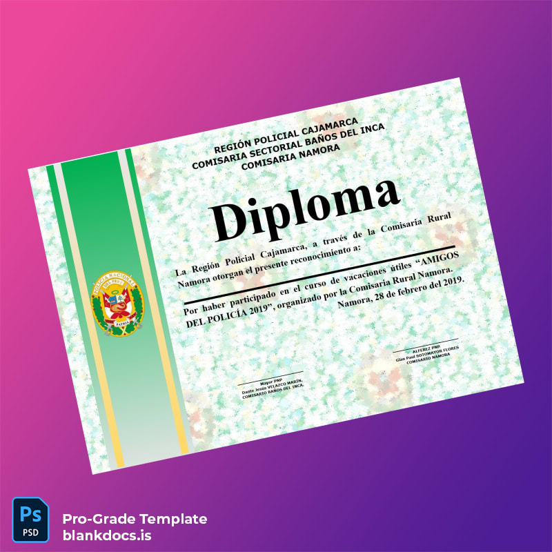 Discover a fully editable and professionally designed diploma template tailored for individuals and institutions seeking a seamless solution to create or replace academic and recognition certificates. This fully customizable Peru Comisaria Rural Namora Diploma of Recognition 2019 Template is expertly crafted to provide a digital diploma download that combines authenticity with flexibility, ensuring your certificates meet the highest standards.