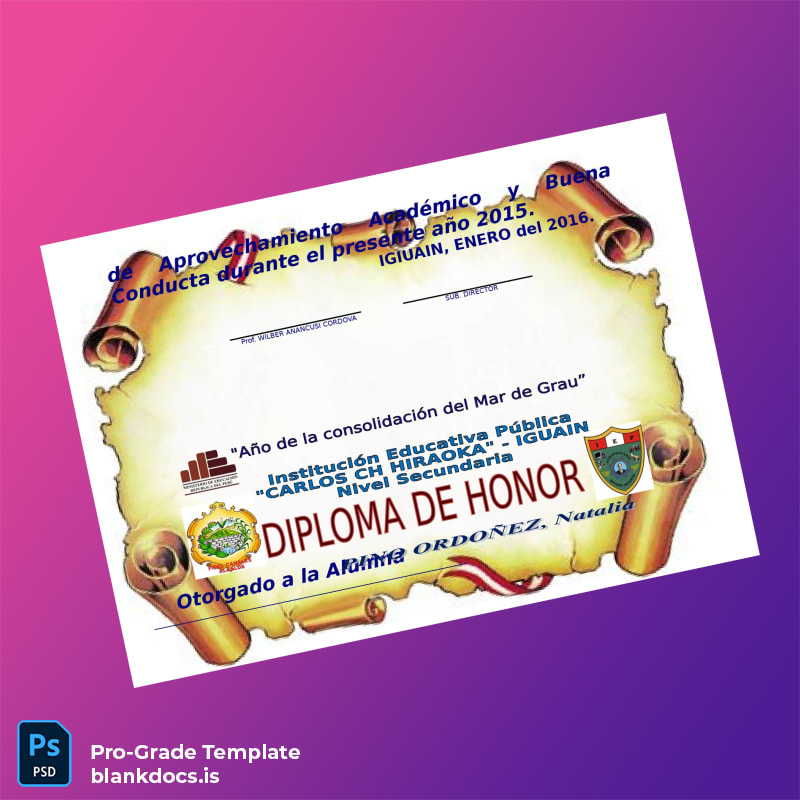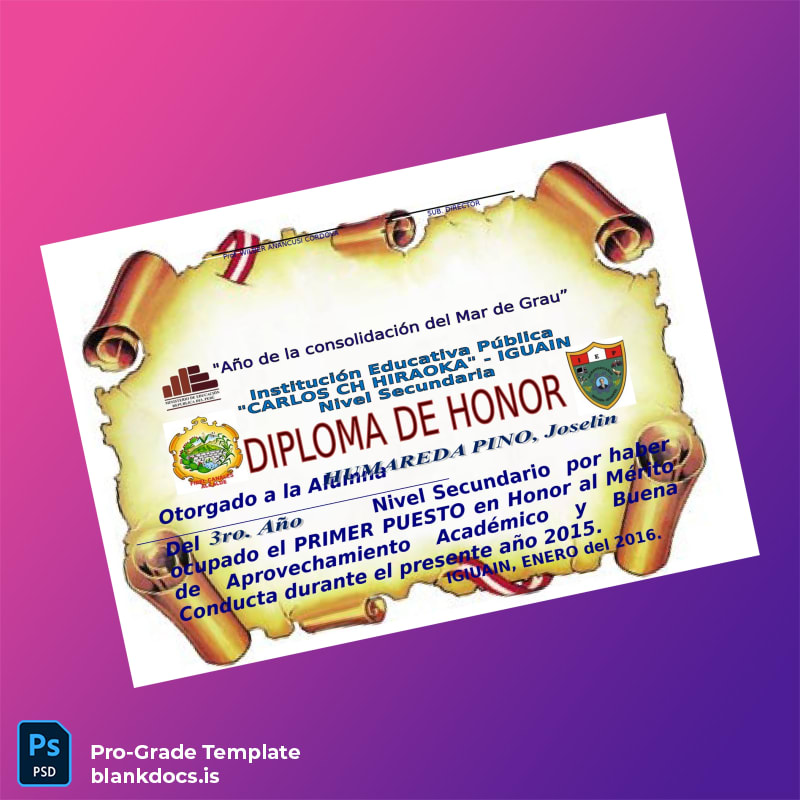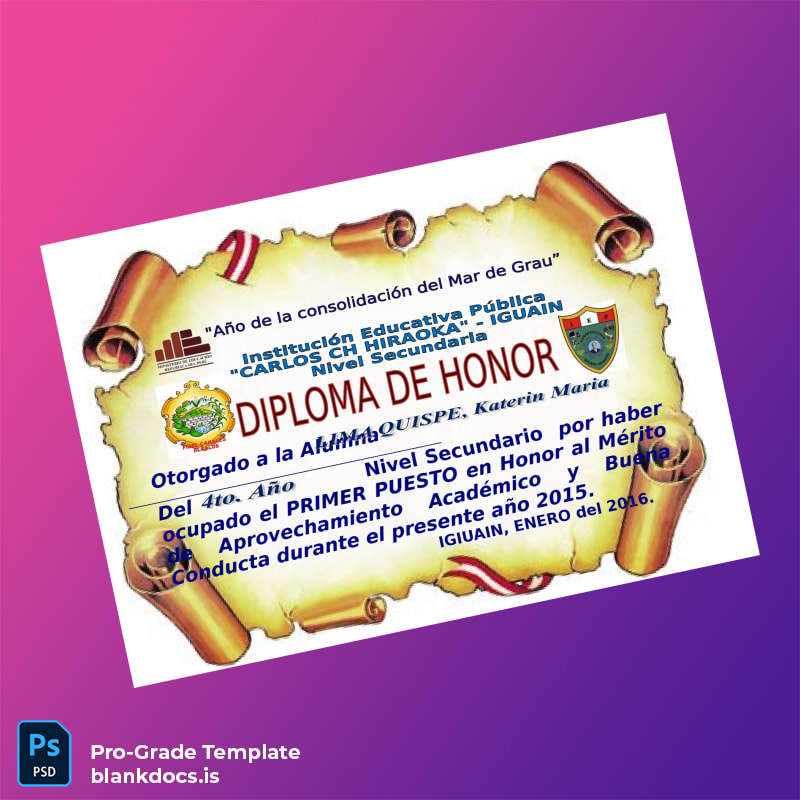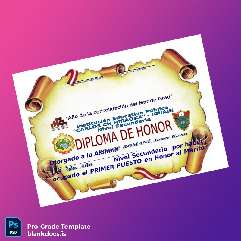 Download the Peru Educational Institution _Carlos Ch Hiraoka_ High School Diploma Template (Word & PDF) today to create flawless, customizable diplomas destined for official use, school archives, or personal replacements.