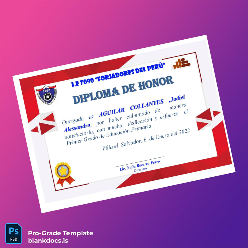 This fully editable diploma template offers a professional and customizable solution for educators, institutions, and individuals seeking to create authentic academic credentials easily. Designed specifically for the Peru I.E 7090 _Forjadores del Perú_ Honor Diploma, this digital diploma download provides a blank diploma form in Word and PDF formats, making it ideal for replacements, updates, or personalized awards.