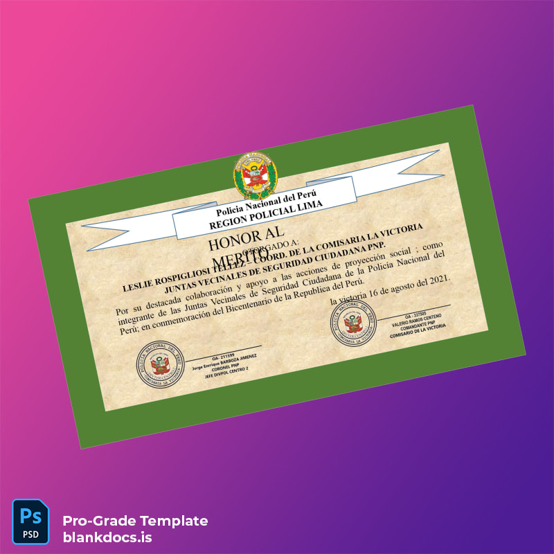 Peru National Police Recognition Diploma Awarded to Leslie Rospigliosi Tellez for Community Service Template (Word & PDF)