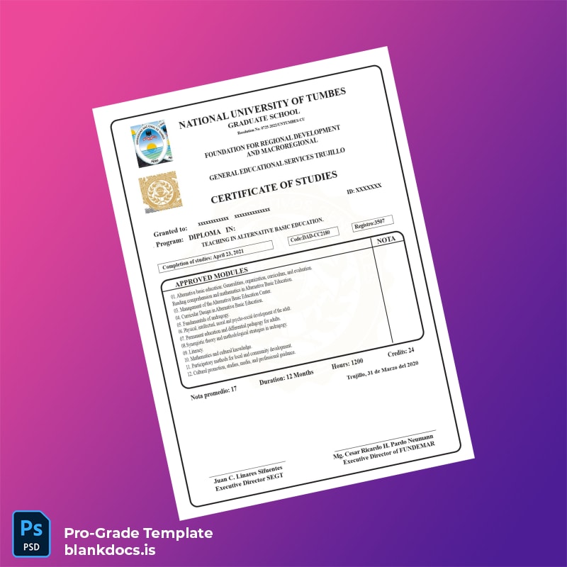 Get the Peru National University of Tumbes Diploma in Teaching in Alternative Basic Education Template (Word & PDF) – a blank, fully editable diploma form for quick customization.