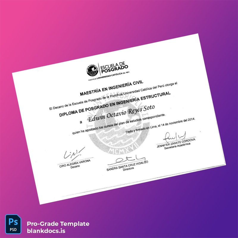 Custom Peru Pontifical Catholic University Master of Science in Civil Engineering Diploma Template (Word & PDF) – Fully Customizable