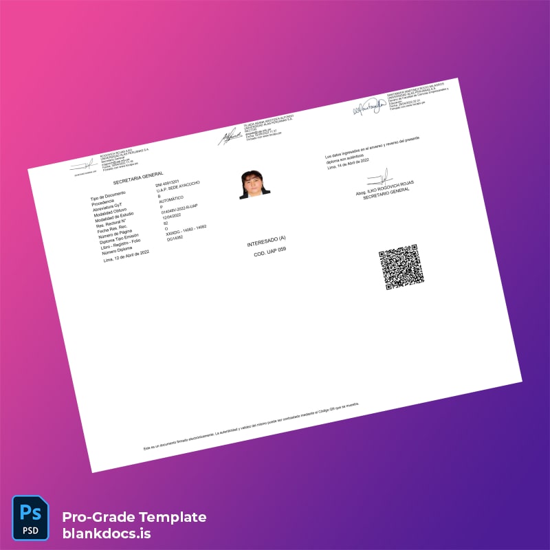 This editable diploma template offers a highly detailed, professional-grade replacement diploma form that users can customize with ease. Designed specifically to replicate the Peru Universidad Alas Peruanas Bachelor of Science in Accounting and Finance Degree, this digital diploma download includes both Word and PDF formats, enabling seamless editing and printing. Whether you need a replacement diploma due to loss, damage, or require a novelty diploma design for educational or theatrical purposes, this template provides an efficient solution for professionals and institutions alike.