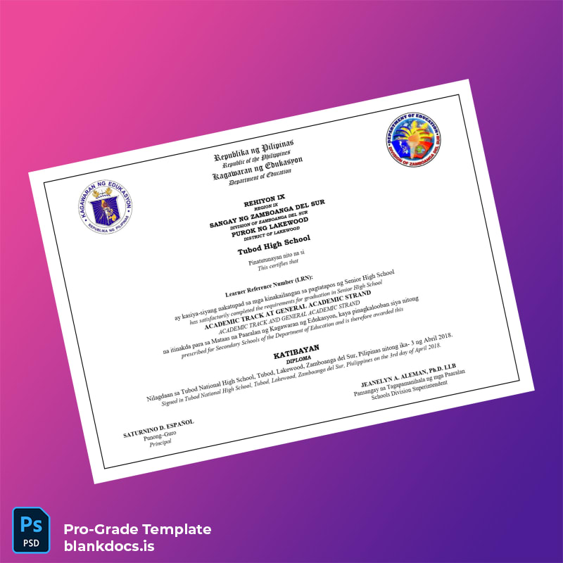 Philippines Tubod High School High School Diploma Template (Word & PDF) – Editable and Professional