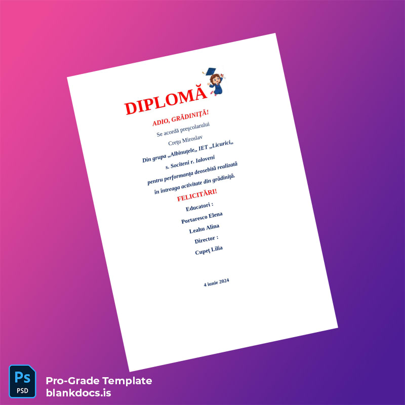 Discover the ultimate solution for educators and administrators seeking a versatile, editable diploma template designed specifically for the Romania Adio Gradinita Preschool. This fully customizable diploma template in both Word and PDF formats offers a seamless way to create authentic, visually appealing diplomas that can be tailored precisely to your institution’s needs.
