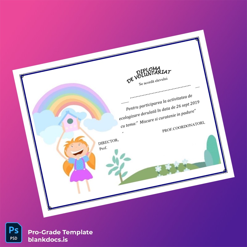 Enhance your professional documentation with the Romania Ecological Activity Participation Diploma Template, a fully editable and customizable solution designed to meet your replacement diploma needs efficiently. This blank diploma form comes in both Word and PDF formats, enabling easy editing and high-quality printing for a polished and authentic appearance. Ideal for educators, event organizers, and environmental institutions, this digital diploma download offers a versatile approach to recognizing ecological involvement.