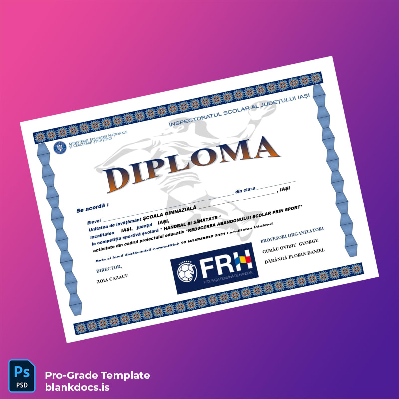 This editable diploma template offers a professional-grade solution for reproducing the Romania School Gymnasium Iasi Handball Diploma easily and accurately. Delivered in both Word and PDF formats, this blank diploma form ensures you have full control over every detail, allowing educators, administrators, and students to customize all text fields to fit specific requirements. Its high-resolution design preserves clarity and sharpness, making it ideal for high-quality printing or digital use.