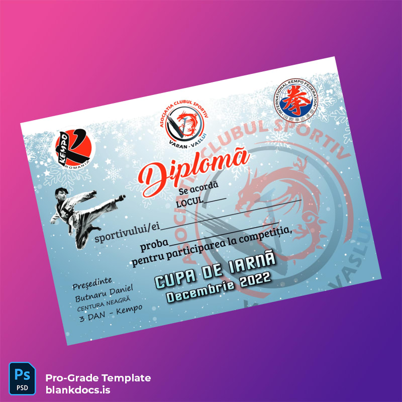 Discover the ultimate solution for creating professional and personalized martial arts credentials with the Romania Varan Vaslui Sports Club Kempo Black Belt Certificate 3 Dan Certificate Template, available in Word and PDF formats. This fully editable diploma template is designed to meet the highest standards of authenticity and quality, providing a seamless editing experience tailored to the unique needs of sports clubs, coaches, and practitioners seeking an elegant yet practical certificate form.