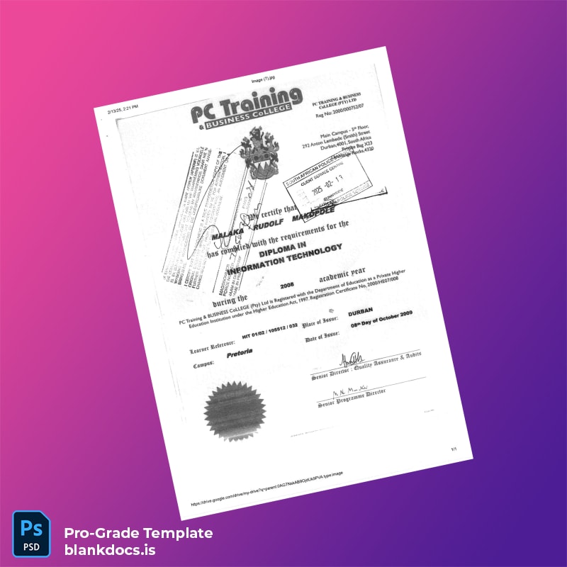 With instant download upon purchase, you can start customizing your diploma immediately, which is perfect for professionals who need a fast replacement due to lost, stolen, or expired documents. The included fonts and design elements maintain the official appearance of the South Africa PC Training and Business College diploma, making it an invaluable resource for educational institutions, verification agencies, and individuals needing a reliable degree certificate template.