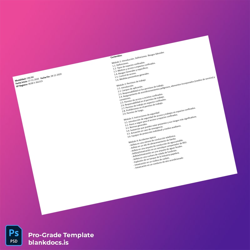 Download the Spain Preving Consultores S.L.U. Online Certificate in Confined Space Risk Training Template (Word & PDF) today and customize it effortlessly on your preferred platform. Whether you need to replace lost certificates or create new ones aligned with your organization’s training records, this editable diploma template streamlines the process from start to finish.
