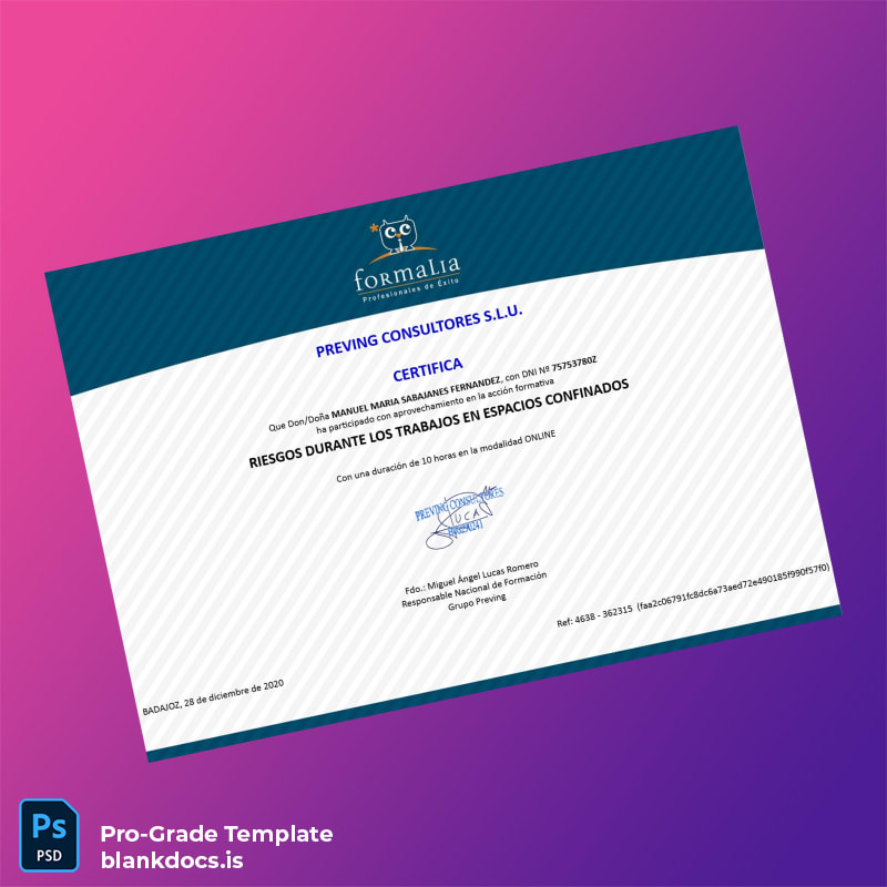 Spain Preving Consultores S.L.U. Online Certificate in Confined Space Risk Training Template (Word & PDF)