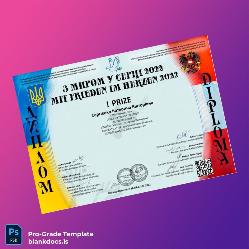 Custom Ukraine International Center First Prize Diploma Template (Word & PDF) Fully Customizable