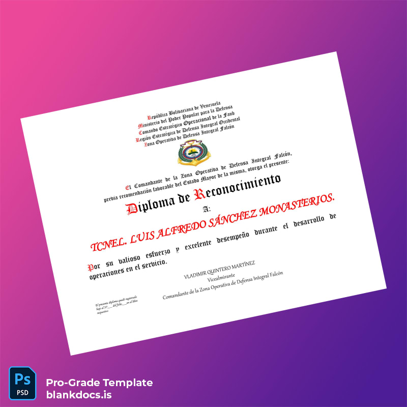 Discover the ultimate solution for creating professional diplomas with the Venezuela Zona Operativa de Defensa Integral Falcón Diploma of Recognition Template. This editable digital template is designed for creative professionals and organizations seeking a highly customizable diploma form that ensures impeccable quality and ease of use. Whether you need to issue a replacement diploma or design a novelty diploma for special recognition, this template offers the versatility and precision you demand.