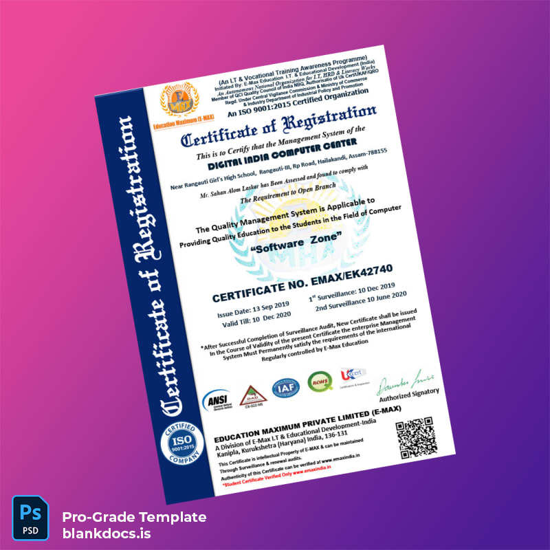Professional India E-Max Education Registration Certificate Template (Word & PDF)