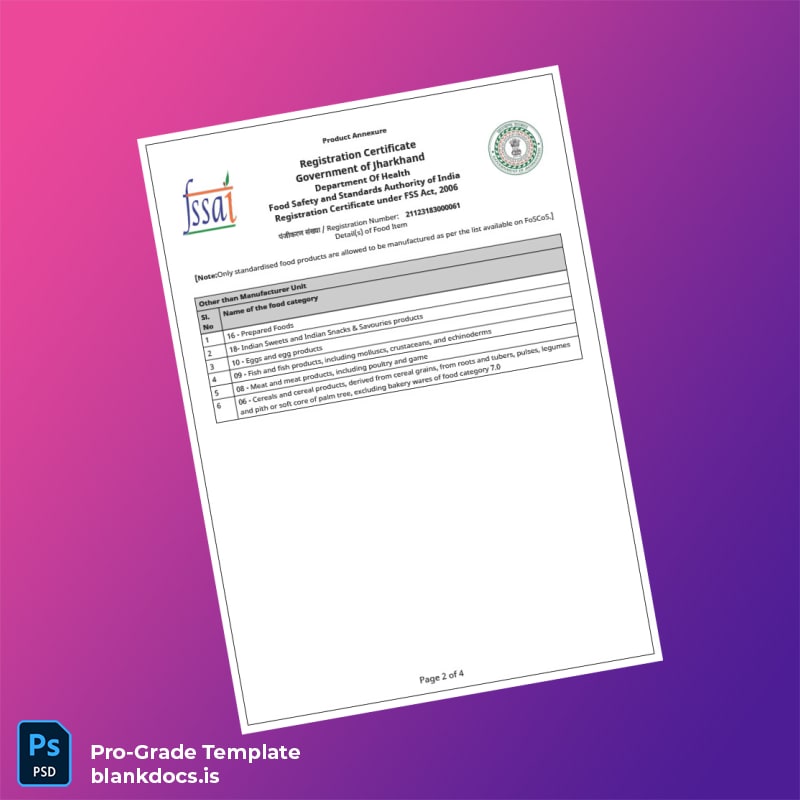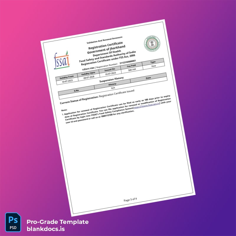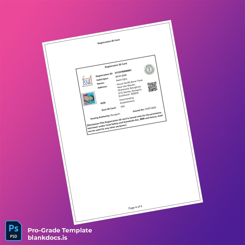 India Food Safety and Standards Authority of India Registration Certificate Template (Word/PDF) 4 page