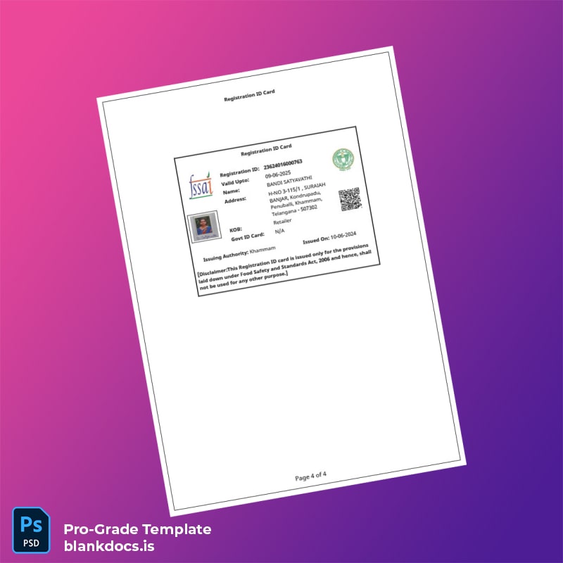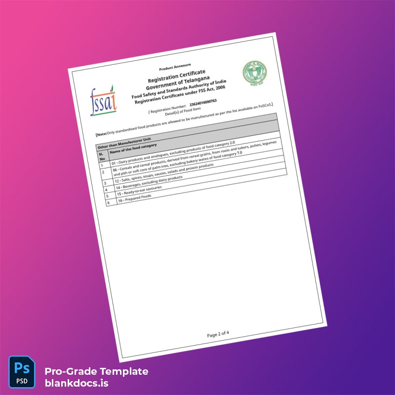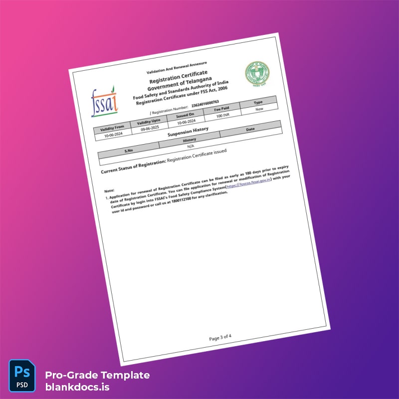 Streamline your business registration process with our India FSSAI Registration Certificate Template, available in fully editable Word and PDF formats. Designed for professionals who need a quick, accurate, and customizable certificate of business registration, this template offers an efficient solution to updating and maintaining your official documents.