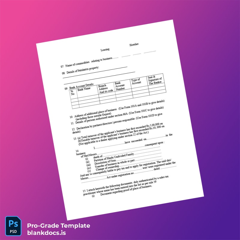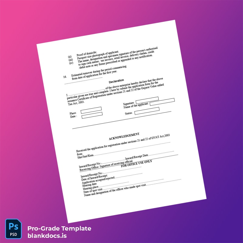 Efficiently managing your company’s legal documentation is crucial for a smooth operational workflow. The India Gujarat Tax Authority Application for Certificate of Registration Template (Word & PDF) offers a professional, editable solution designed to simplify the certificate application process. Whether you are a startup founder, a legal consultant, or a business administrator, this template empowers you to quickly create an official-looking registration certificate tailored to Gujarat’s tax authority requirements.